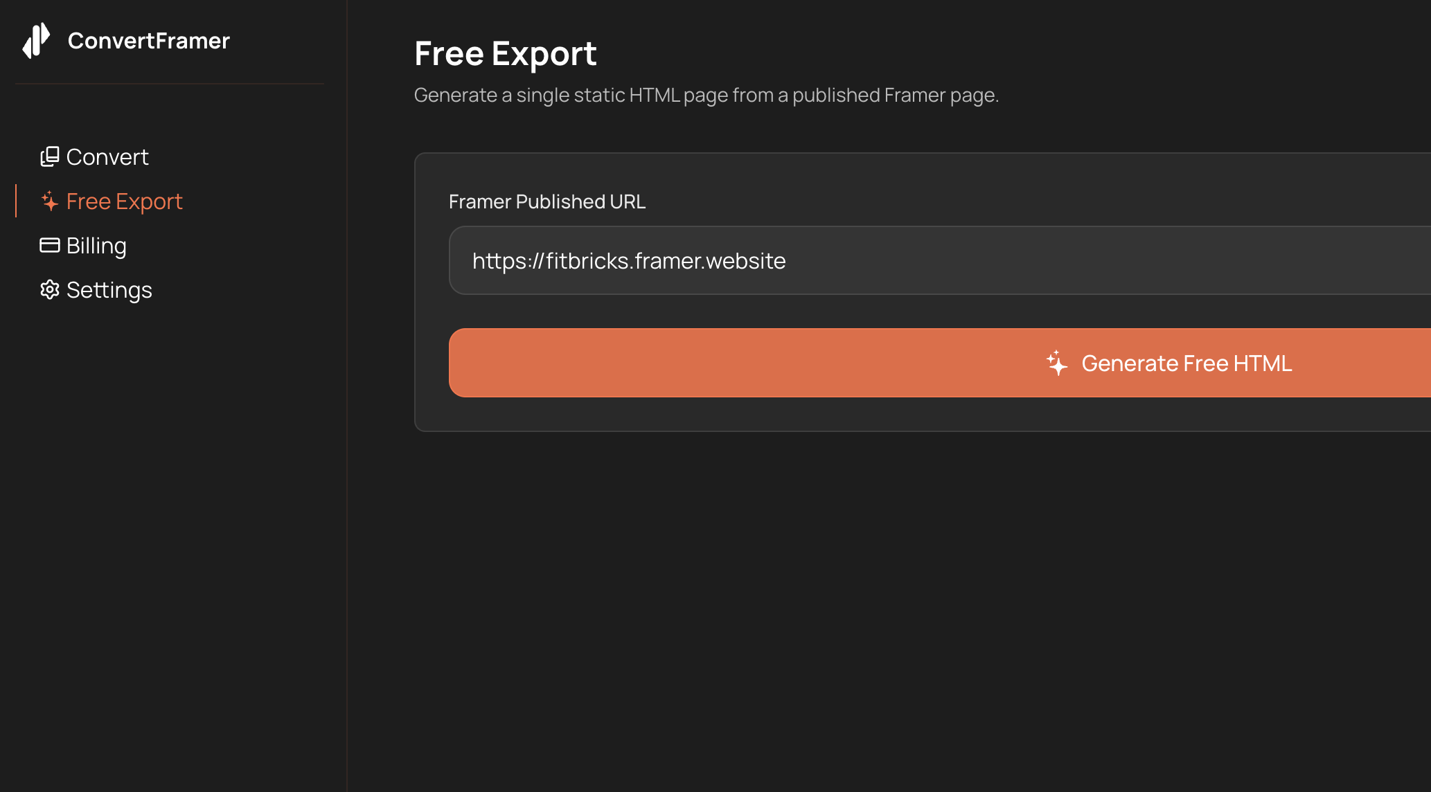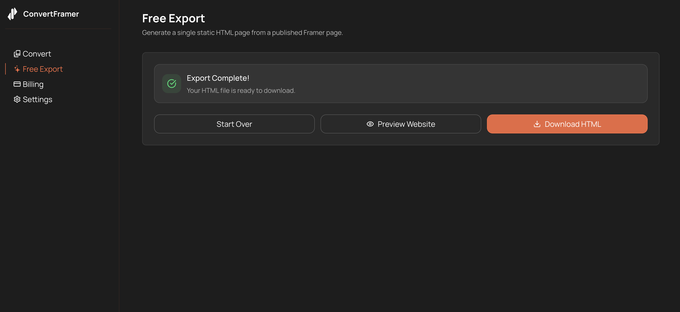 The Free Export gives you speed and convenience. It packages your published Framer site into a standalone HTML snapshot.